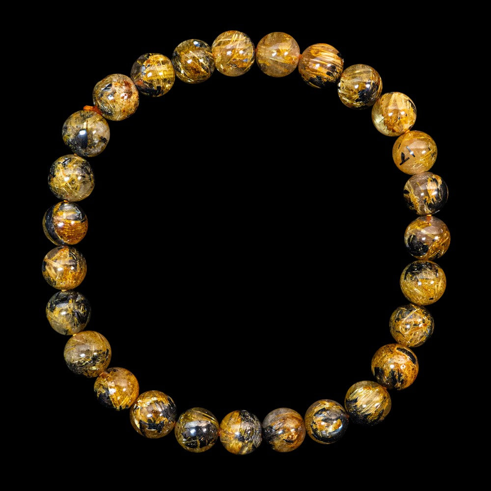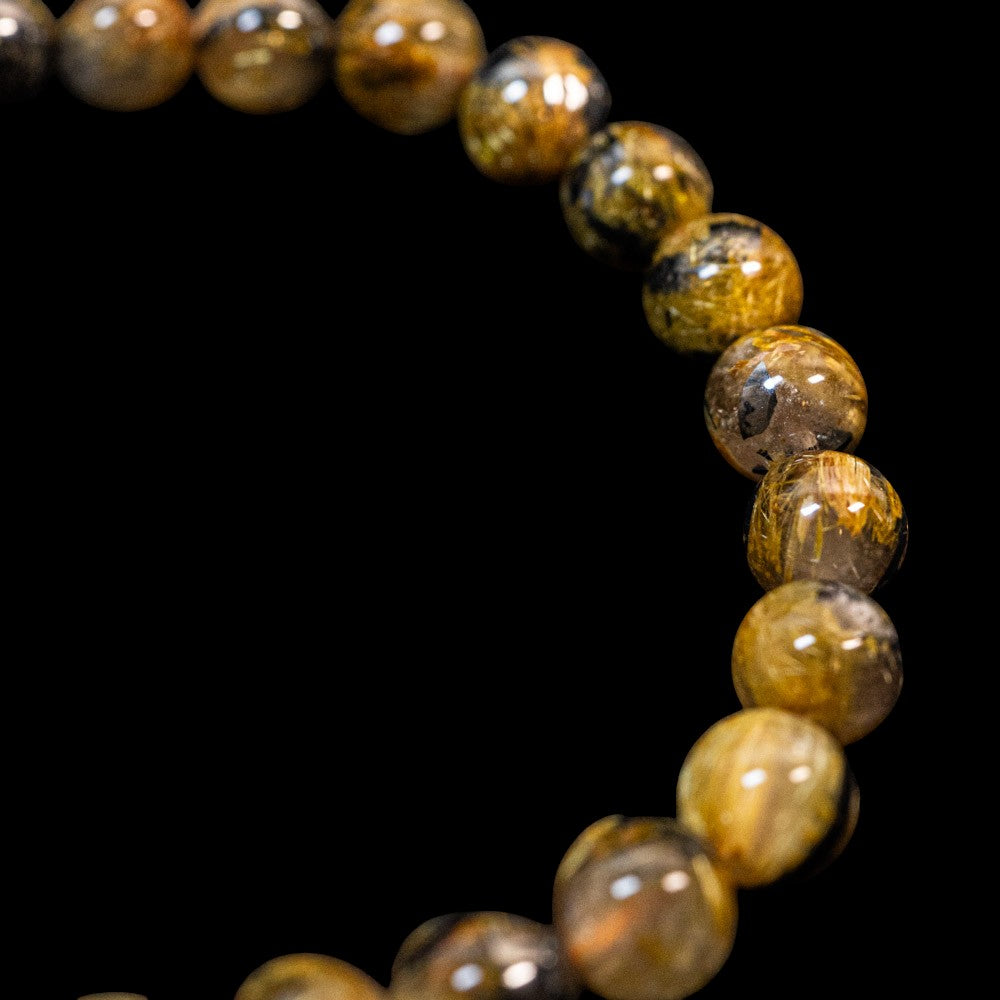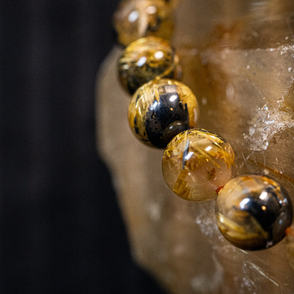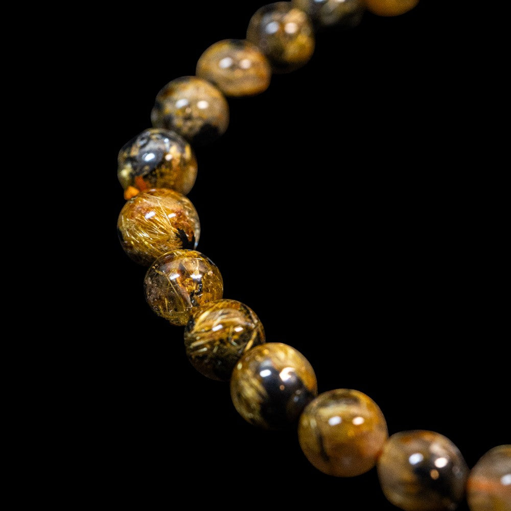 このブレスレットは、高品質なブラジル産ルチルクオーツを使用しています。太陽ルチル(ヘマタイト/ルチル)クオーツは、金属光沢のある黒いヘマタイトを核として、その周りに金紅石のルチル結晶が伸びている特殊なルチルクォーツです。「太陽ルチル」や「スタールチル」とも呼ばれています。内包された黄金色のルチル(金線)が魅力的で、その輝きが「金運の石」として多くの方に親しまれています。