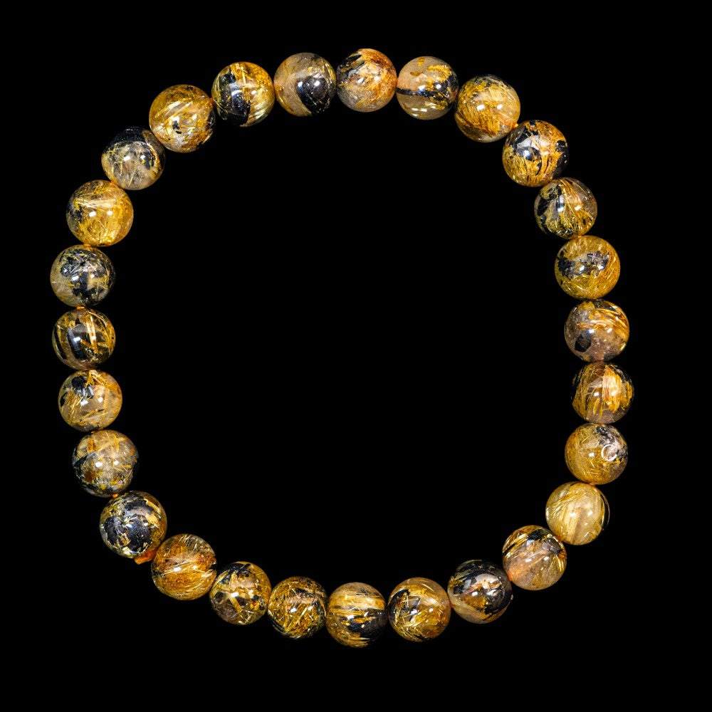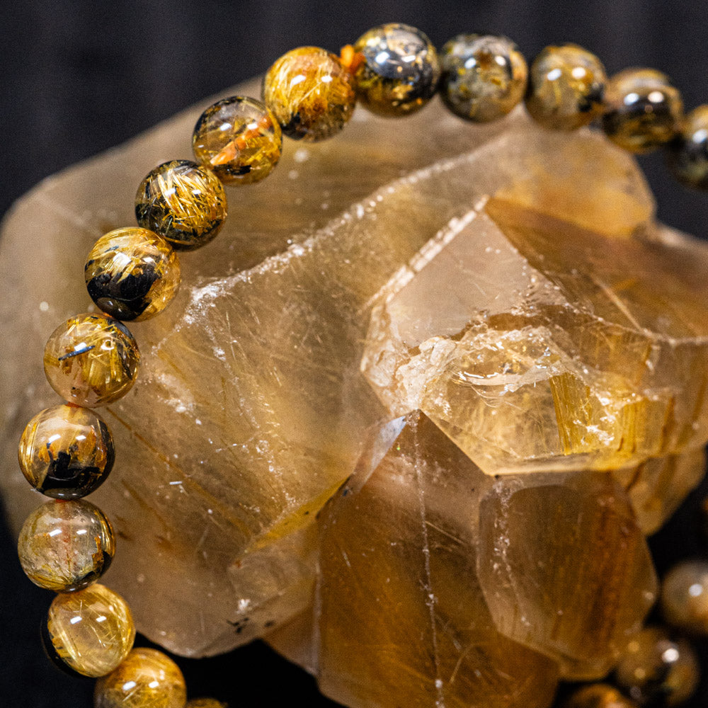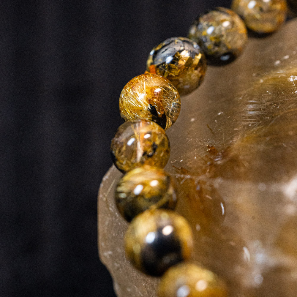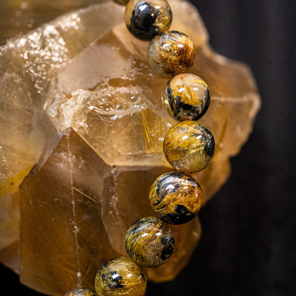 このブレスレットは、高品質なブラジル産ルチルクオーツを使用しています。太陽ルチル(ヘマタイト/ルチル)クオーツは、金属光沢のある黒いヘマタイトを核として、その周りに金紅石のルチル結晶が伸びている特殊なルチルクォーツです。「太陽ルチル」や「スタールチル」とも呼ばれています。内包された黄金色のルチル(金線)が魅力的で、その輝きが「金運の石」として多くの方に親しまれています。