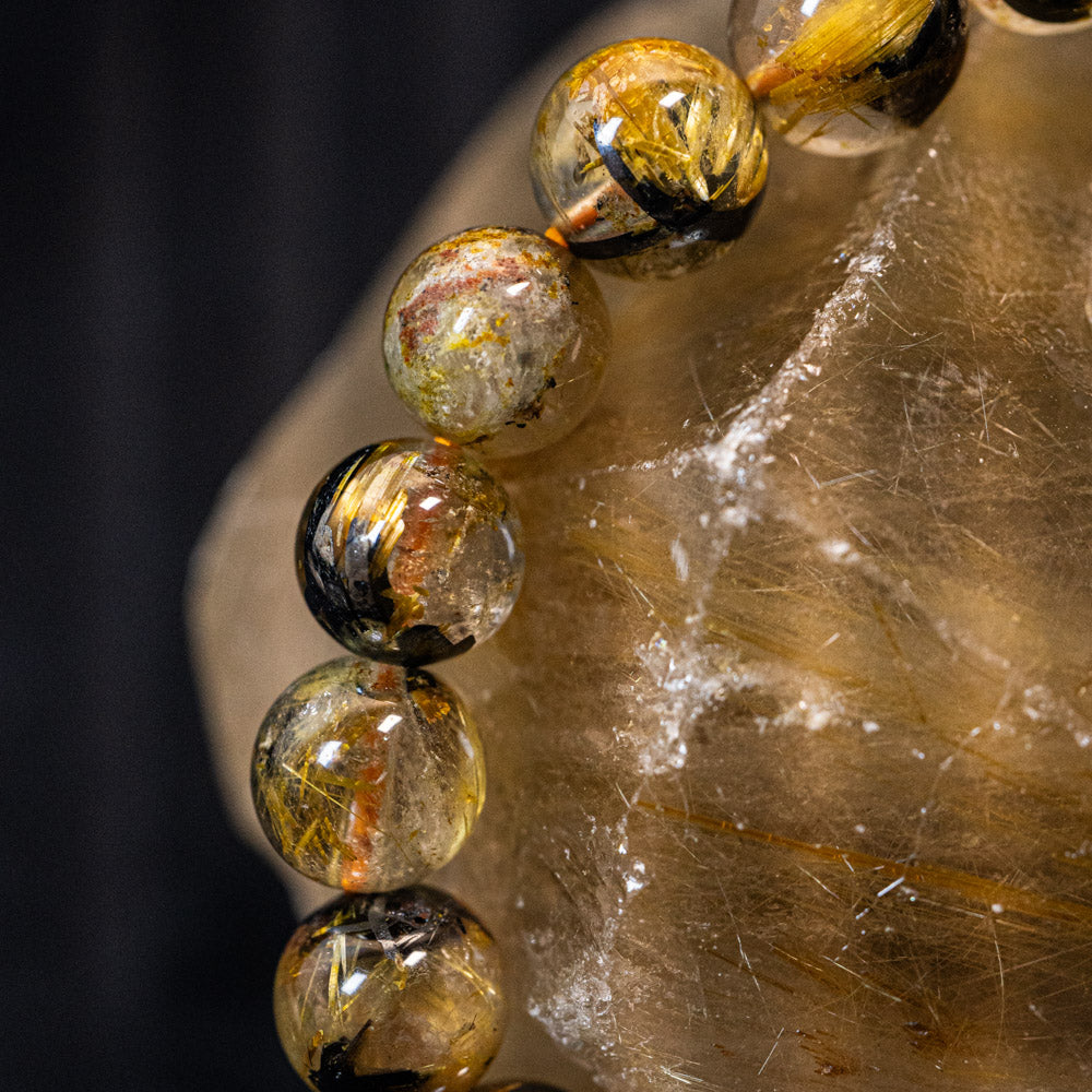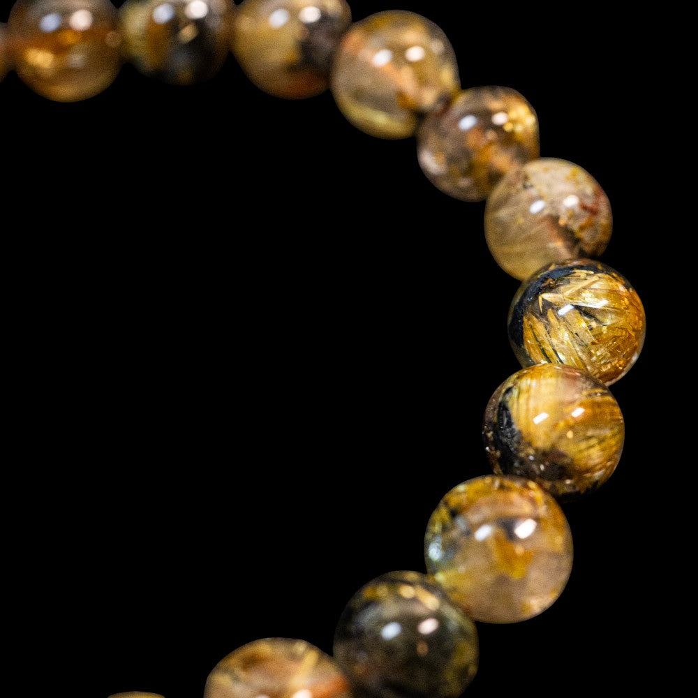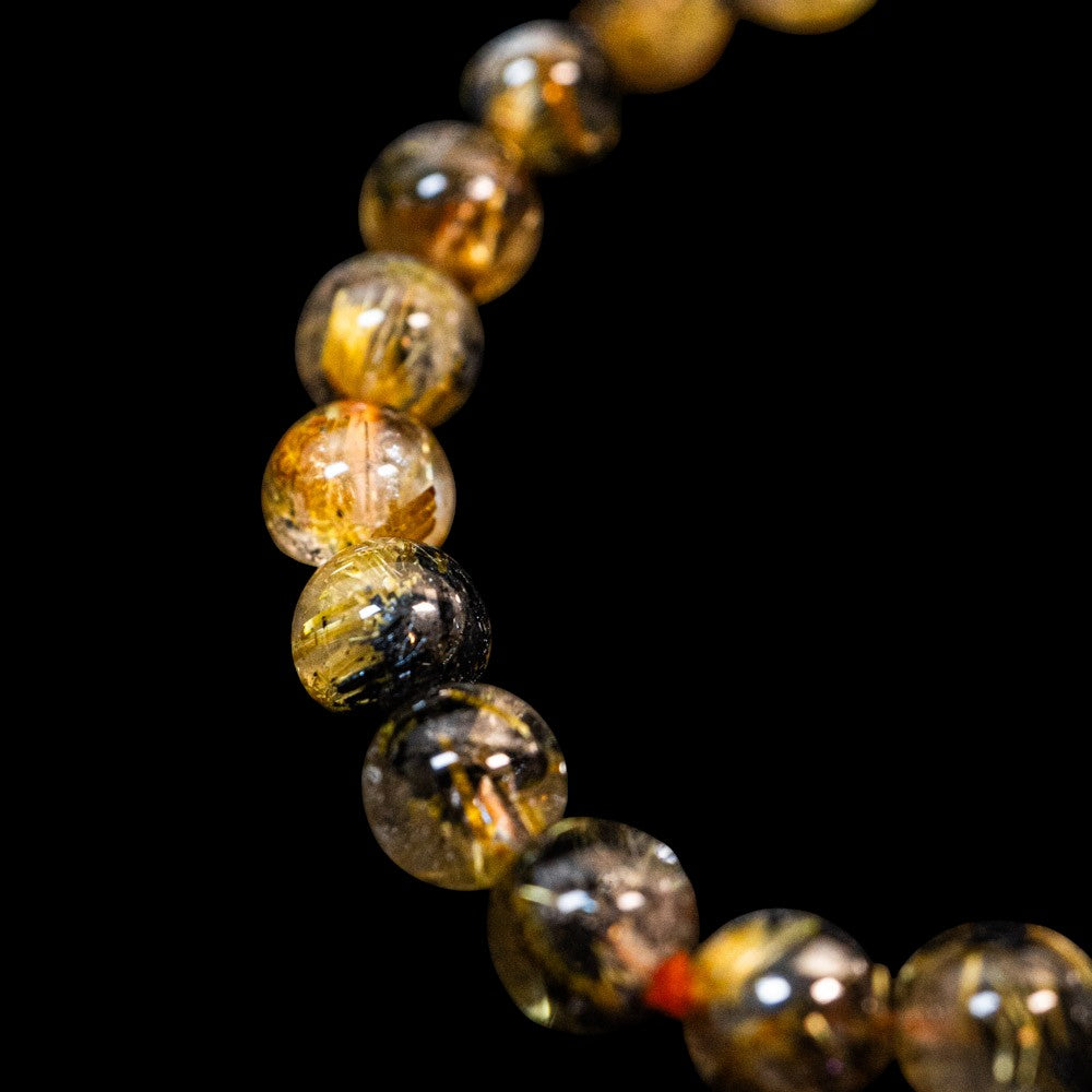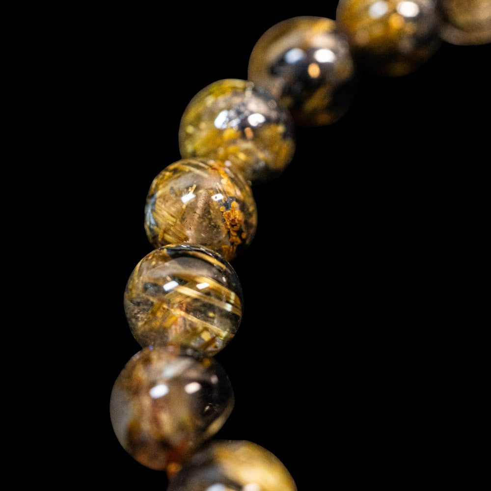 このブレスレットは、高品質なブラジル産ルチルクオーツを使用しています。太陽ルチル(ヘマタイト/ルチル)クオーツは、金属光沢のある黒いヘマタイトを核として、その周りに金紅石のルチル結晶が伸びている特殊なルチルクォーツです。「太陽ルチル」や「スタールチル」とも呼ばれています。内包された黄金色のルチル(金線)が魅力的で、その輝きが「金運の石」として多くの方に親しまれています。