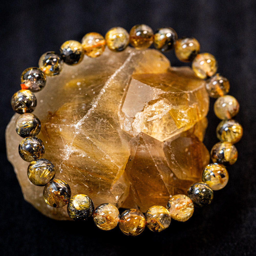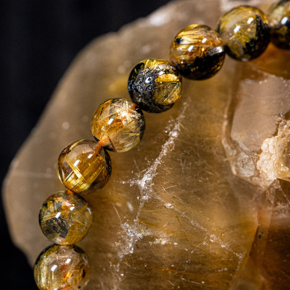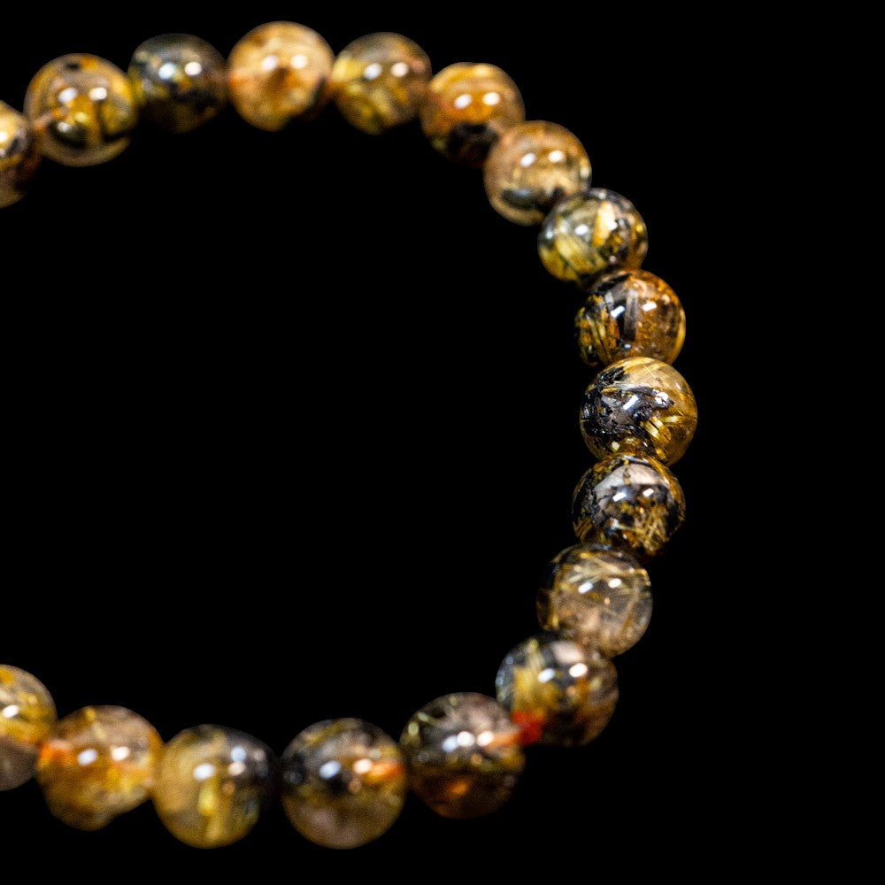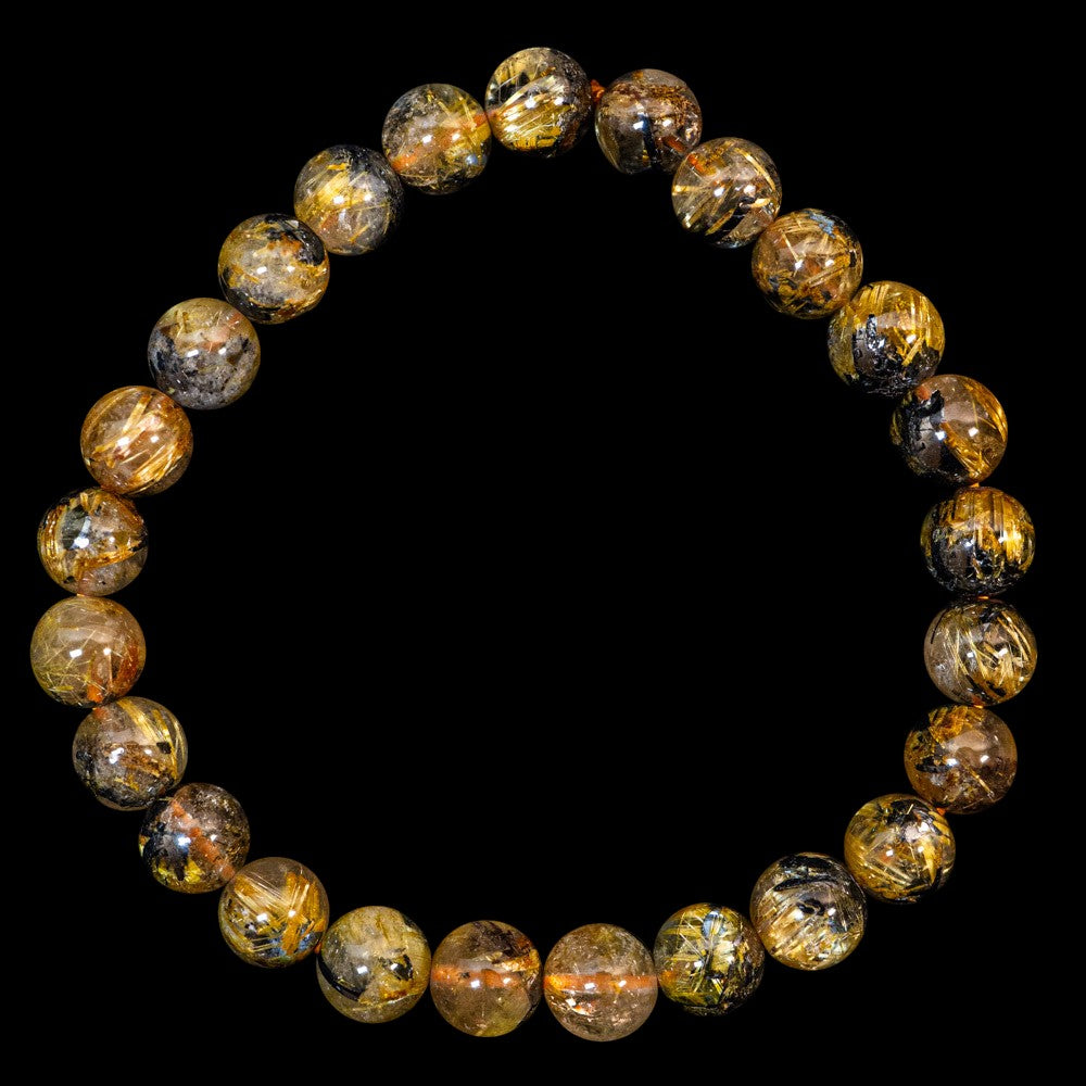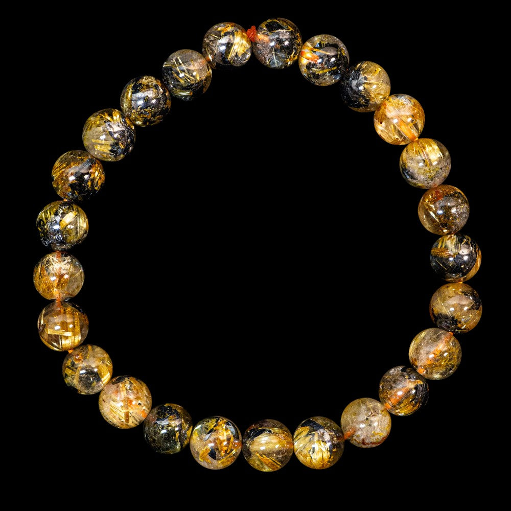 このブレスレットは、高品質なブラジル産ルチルクオーツを使用しています。太陽ルチル(ヘマタイト/ルチル)クオーツは、金属光沢のある黒いヘマタイトを核として、その周りに金紅石のルチル結晶が伸びている特殊なルチルクォーツです。「太陽ルチル」や「スタールチル」とも呼ばれています。内包された黄金色のルチル(金線)が魅力的で、その輝きが「金運の石」として多くの方に親しまれています。