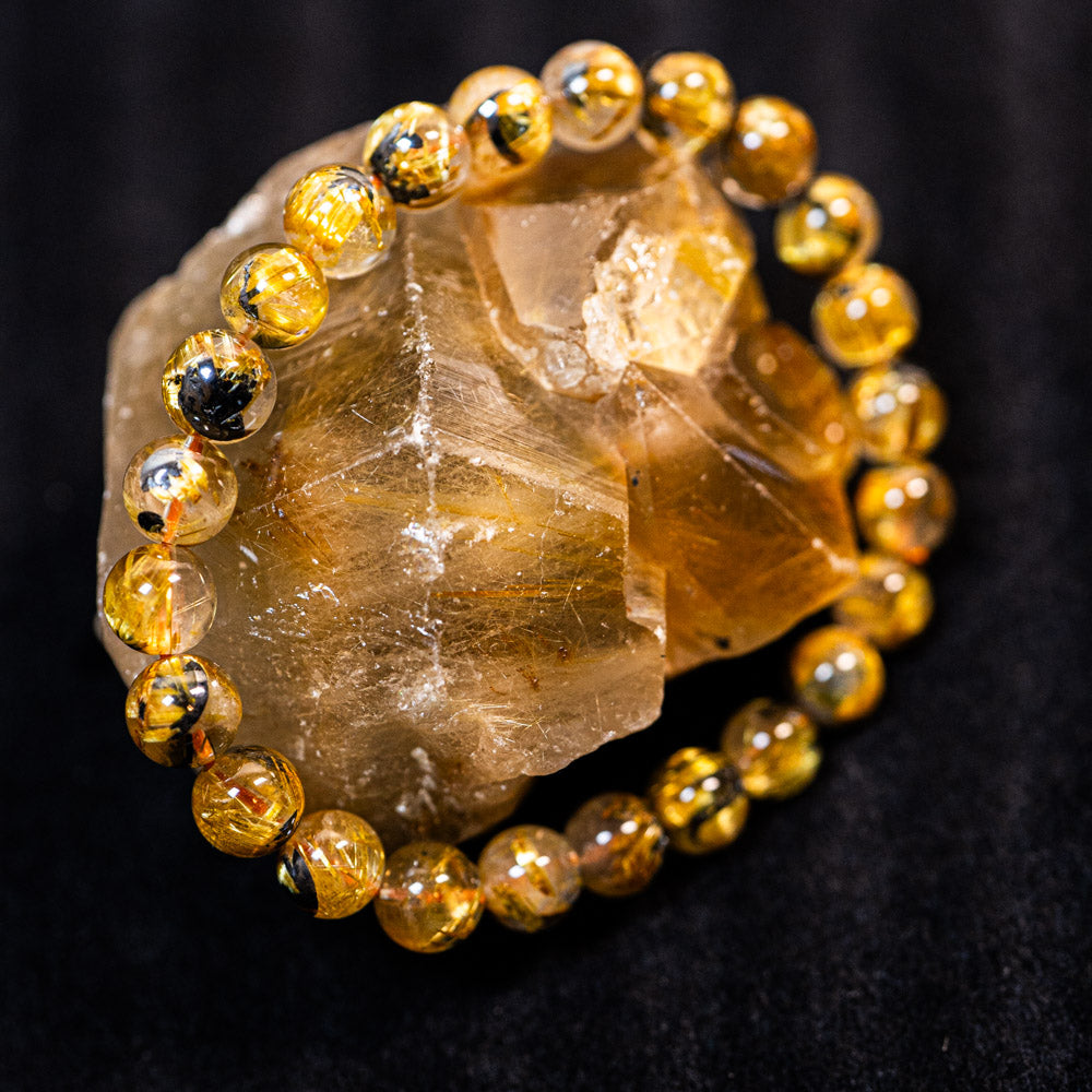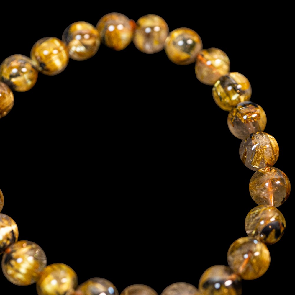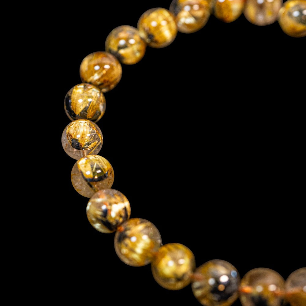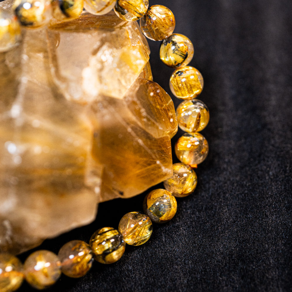 このブレスレットは、高品質なブラジル産ルチルクオーツを使用しています。太陽ルチル(ヘマタイト/ルチル)クオーツは、金属光沢のある黒いヘマタイトを核として、その周りに金紅石のルチル結晶が伸びている特殊なルチルクォーツです。「太陽ルチル」や「スタールチル」とも呼ばれています。内包された黄金色のルチル(金線)が魅力的で、その輝きが「金運の石」として多くの方に親しまれています。