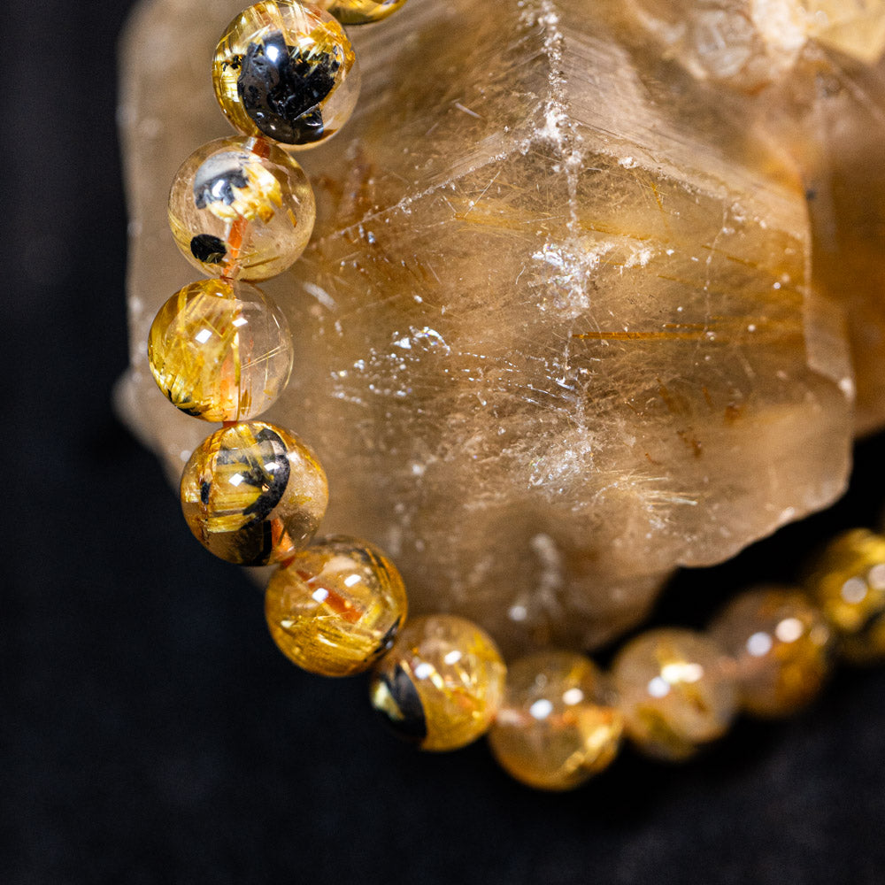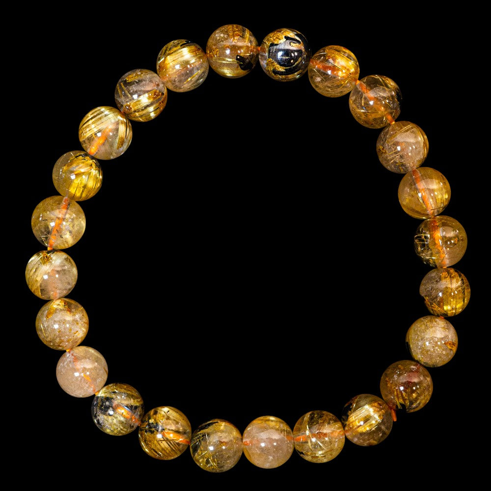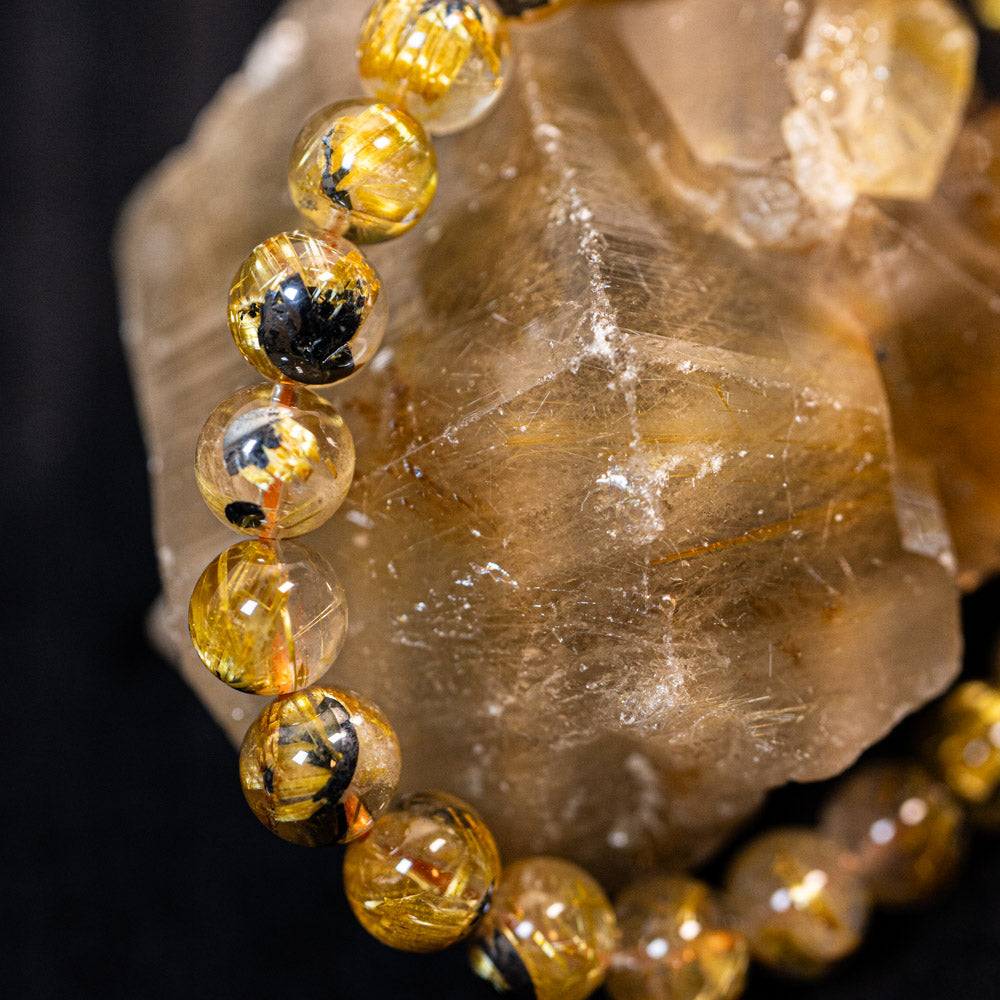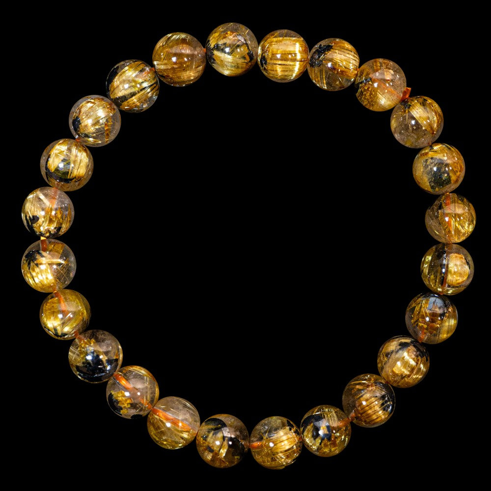 このブレスレットは、高品質なブラジル産ルチルクオーツを使用しています。太陽ルチル(ヘマタイト/ルチル)クオーツは、金属光沢のある黒いヘマタイトを核として、その周りに金紅石のルチル結晶が伸びている特殊なルチルクォーツです。「太陽ルチル」や「スタールチル」とも呼ばれています。内包された黄金色のルチル(金線)が魅力的で、その輝きが「金運の石」として多くの方に親しまれています。