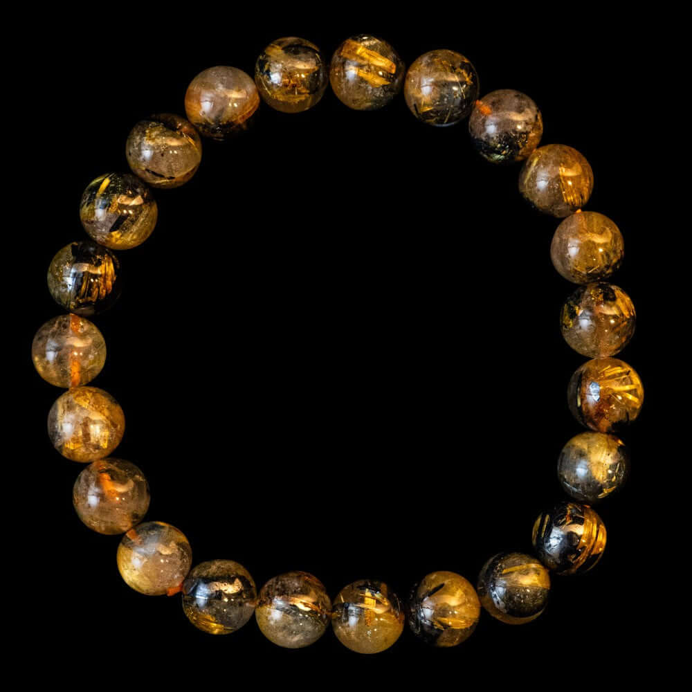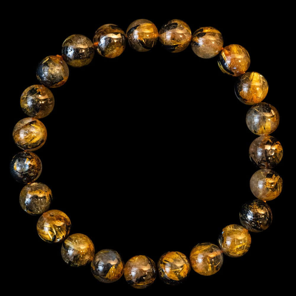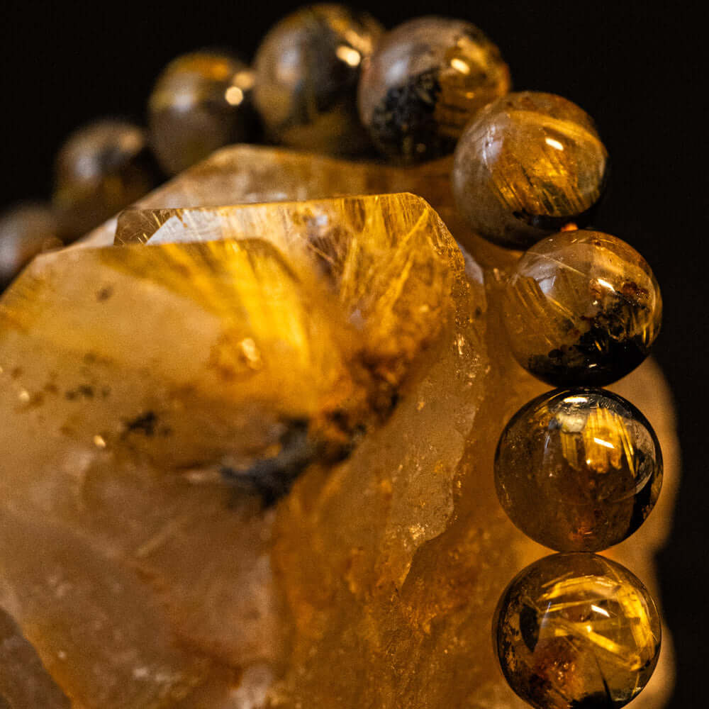このブレスレットは、高品質なブラジル産ルチルクオーツを使用しています。太陽ルチル(ヘマタイト/ルチル)クオーツは、金属光沢のある黒いヘマタイトを核として、その周りに金紅石のルチル結晶が伸びている特殊なルチルクォーツです。「太陽ルチル」や「スタールチル」とも呼ばれています。内包された黄金色のルチル(金線)が魅力的で、その輝きが「金運の石」として多くの方に親しまれています。