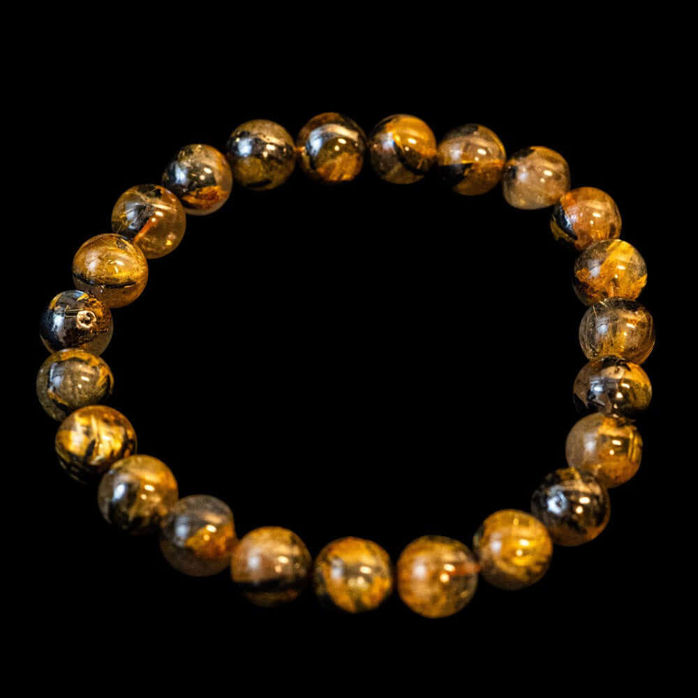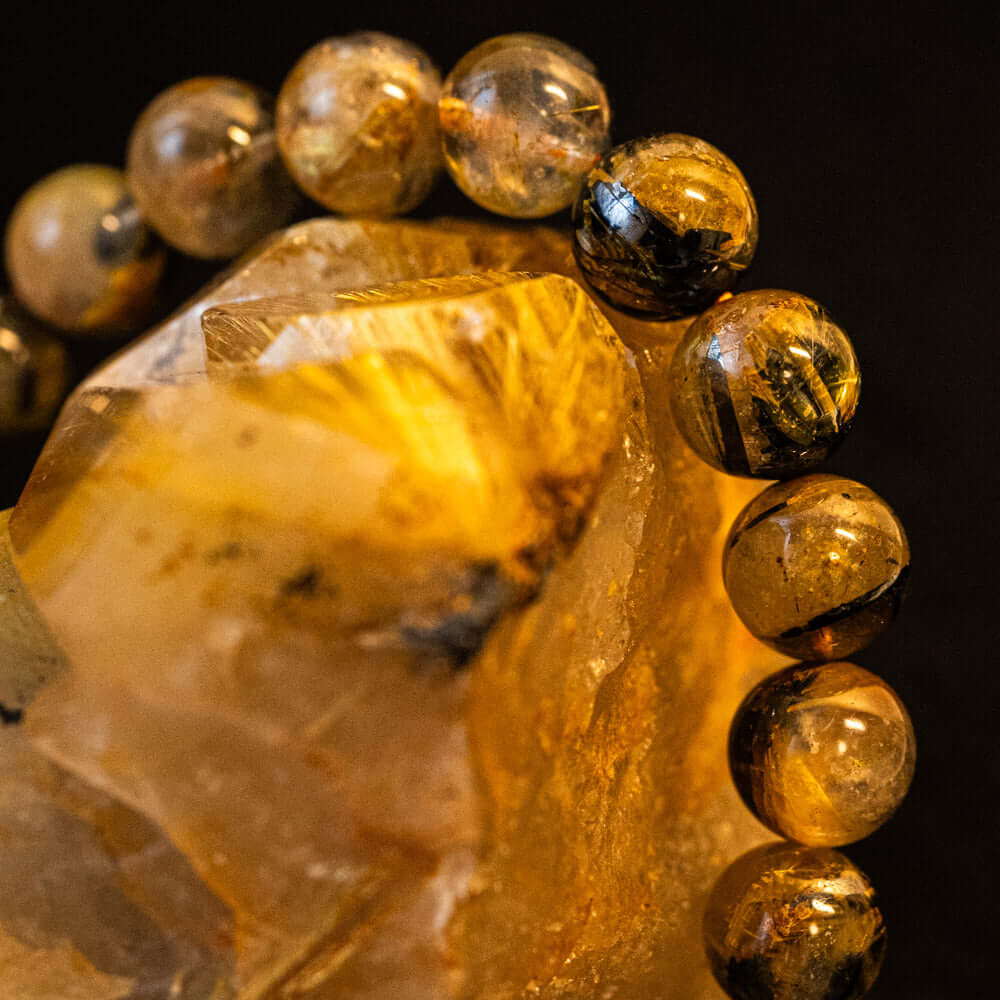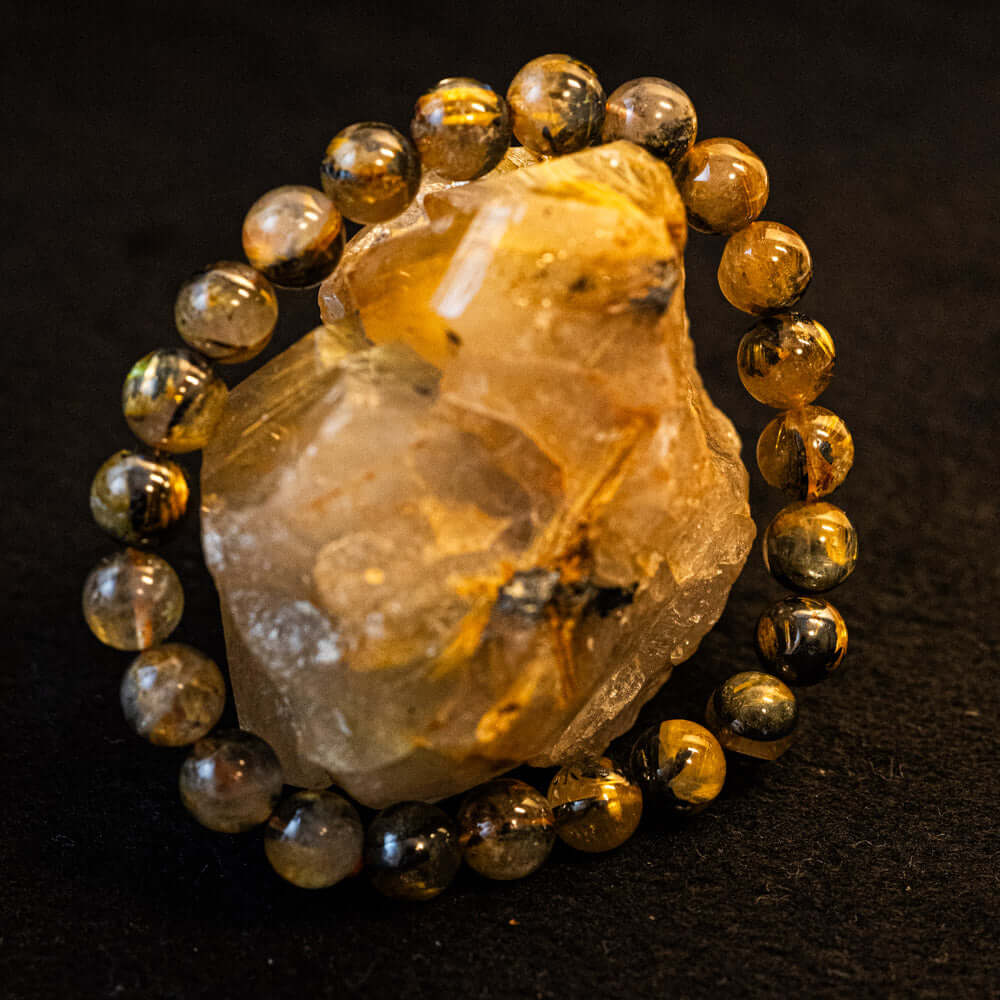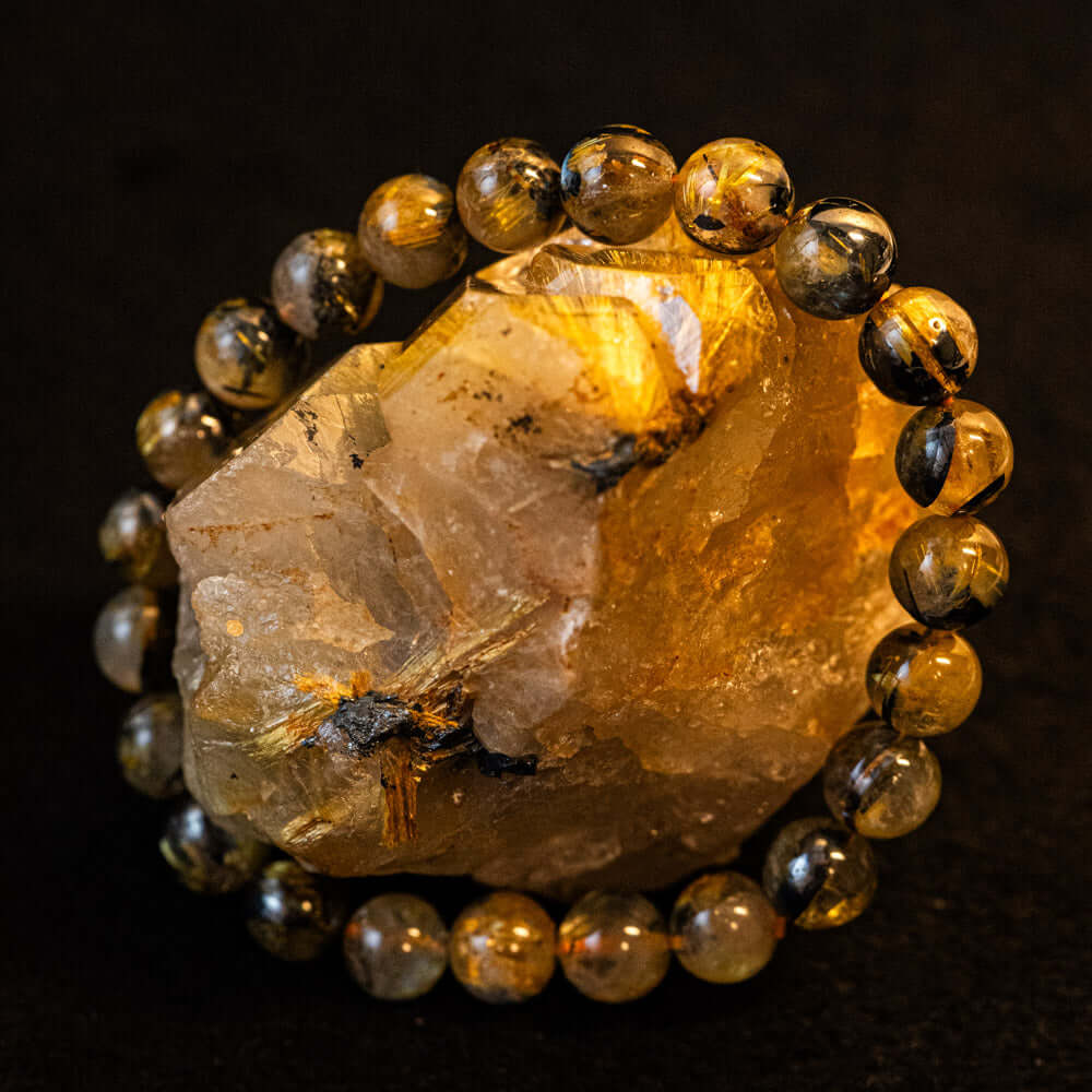 このブレスレットは、高品質なブラジル産ルチルクオーツを使用しています。太陽ルチル(ヘマタイト/ルチル)クオーツは、金属光沢のある黒いヘマタイトを核として、その周りに金紅石のルチル結晶が伸びている特殊なルチルクォーツです。「太陽ルチル」や「スタールチル」とも呼ばれています。内包された黄金色のルチル(金線)が魅力的で、その輝きが「金運の石」として多くの方に親しまれています。