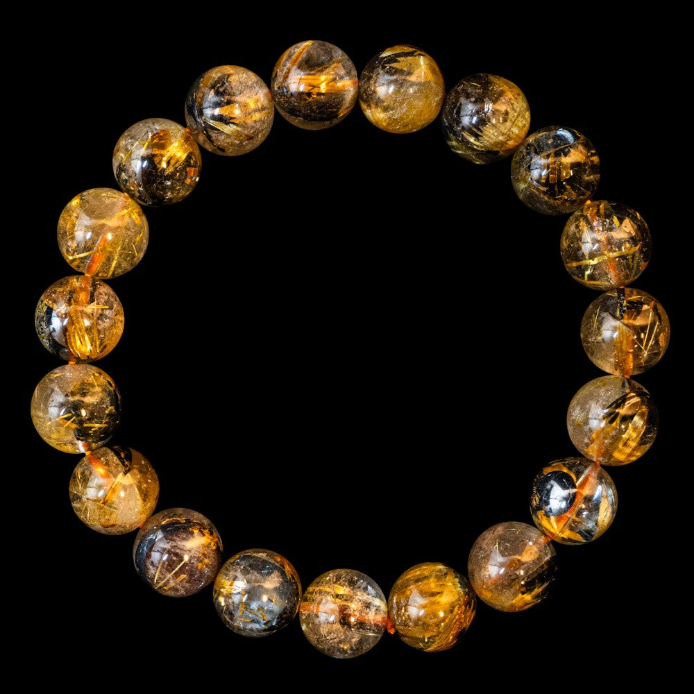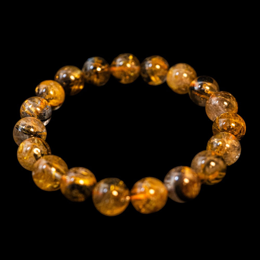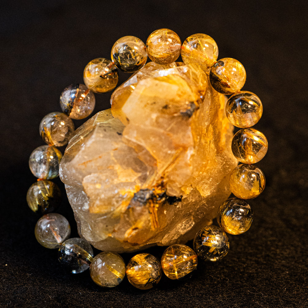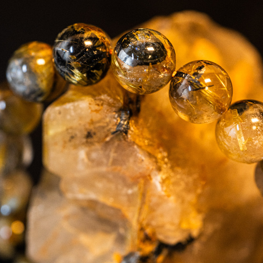このブレスレットは、高品質なブラジル産ルチルクオーツを使用しています。太陽ルチル(ヘマタイト/ルチル)クオーツは、金属光沢のある黒いヘマタイトを核として、その周りに金紅石のルチル結晶が伸びている特殊なルチルクォーツです。「太陽ルチル」や「スタールチル」とも呼ばれています。内包された黄金色のルチル(金線)が魅力的で、その輝きが「金運の石」として多くの方に親しまれています。
