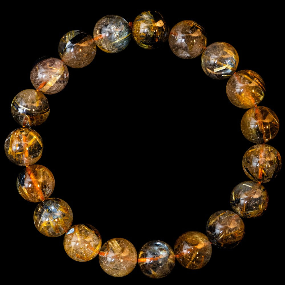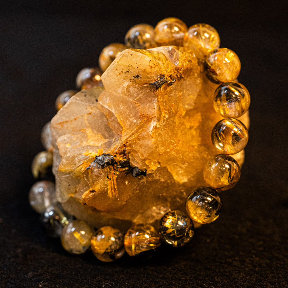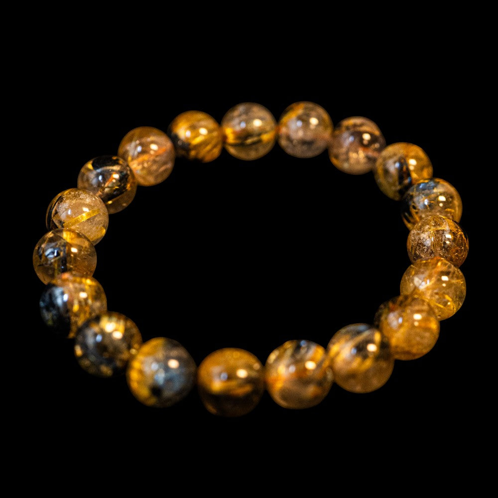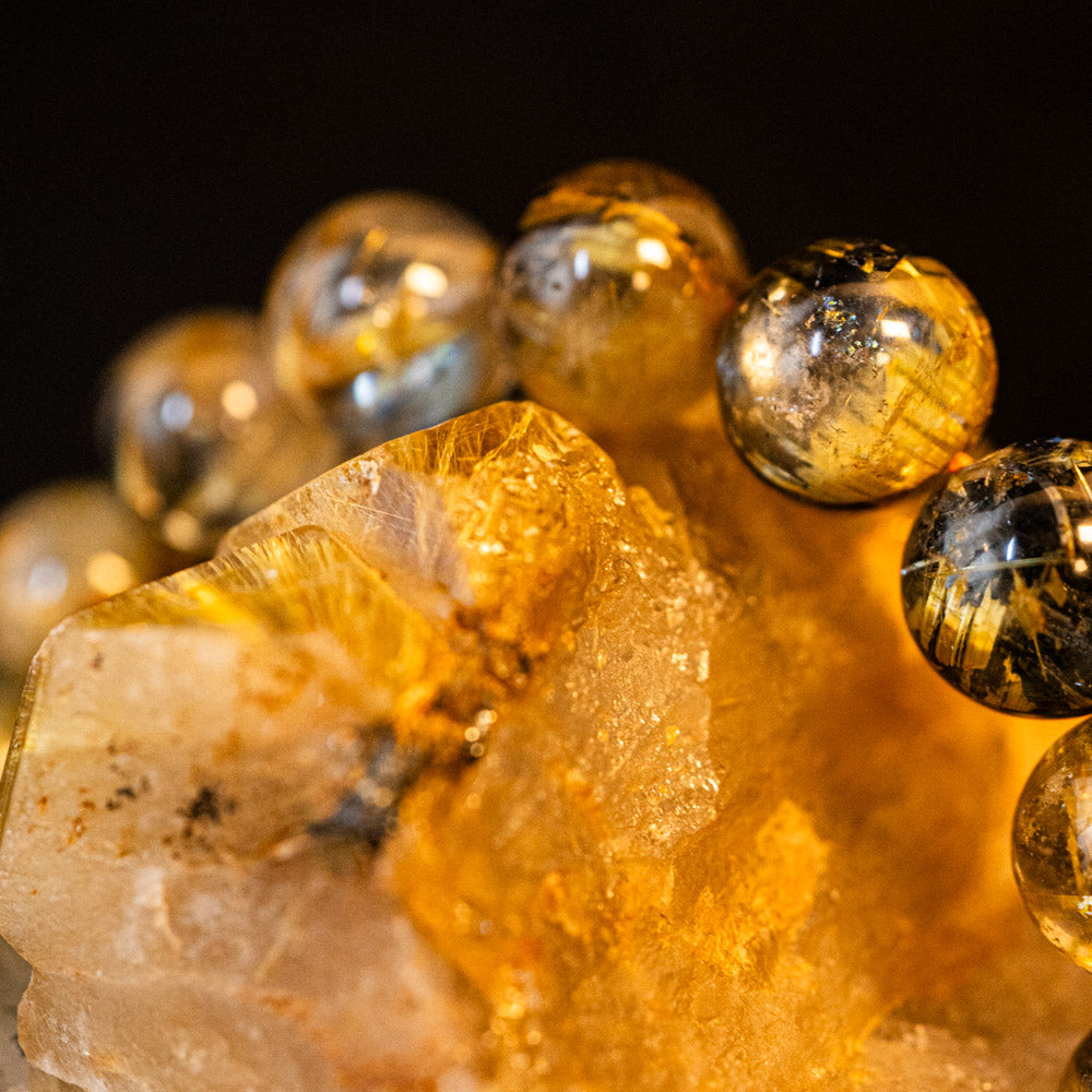 このブレスレットは、高品質なブラジル産ルチルクオーツを使用しています。太陽ルチル(ヘマタイト/ルチル)クオーツは、金属光沢のある黒いヘマタイトを核として、その周りに金紅石のルチル結晶が伸びている特殊なルチルクォーツです。「太陽ルチル」や「スタールチル」とも呼ばれています。内包された黄金色のルチル(金線)が魅力的で、その輝きが「金運の石」として多くの方に親しまれています。