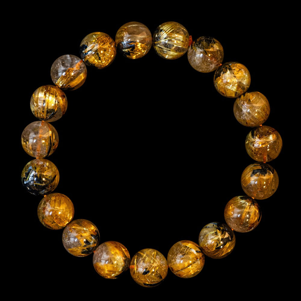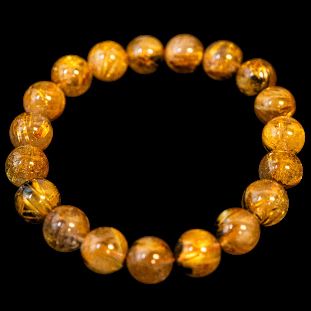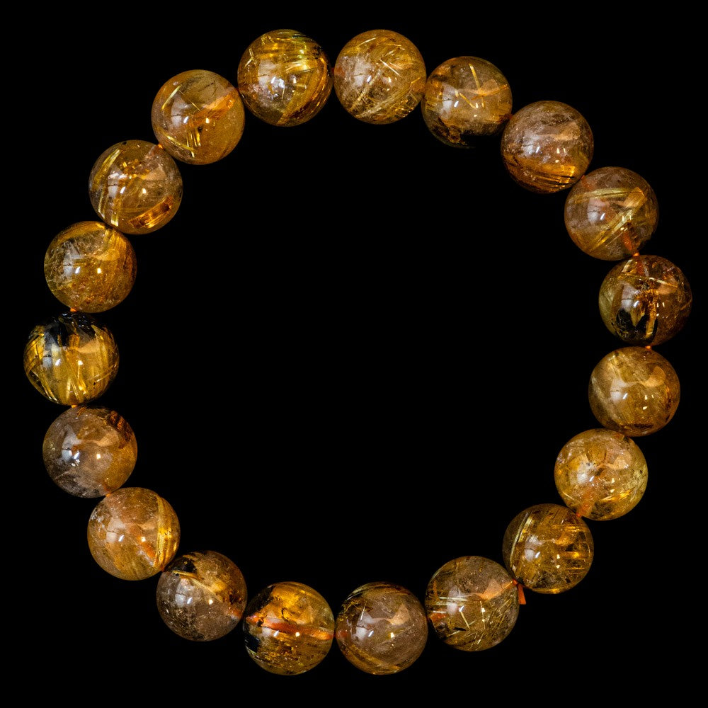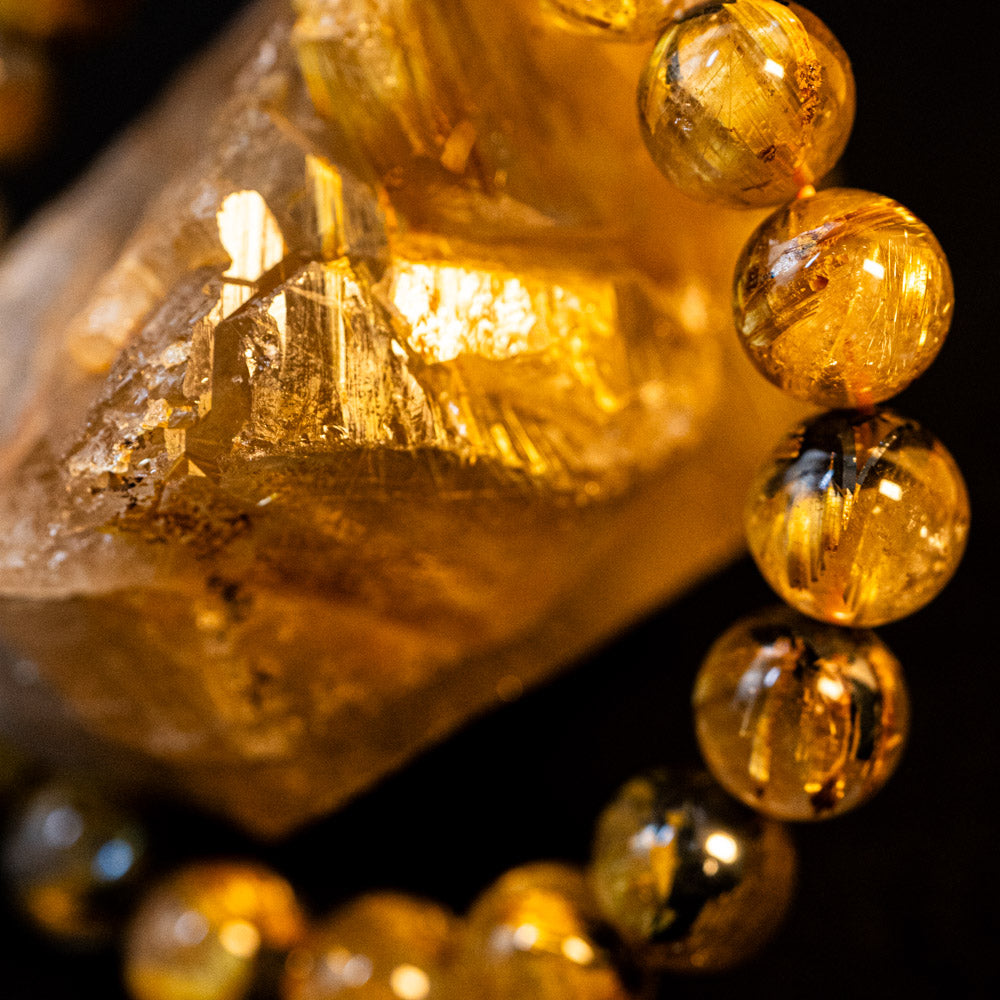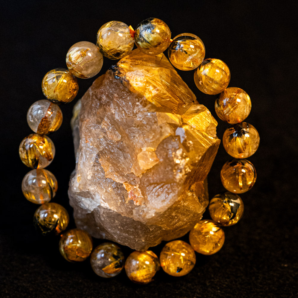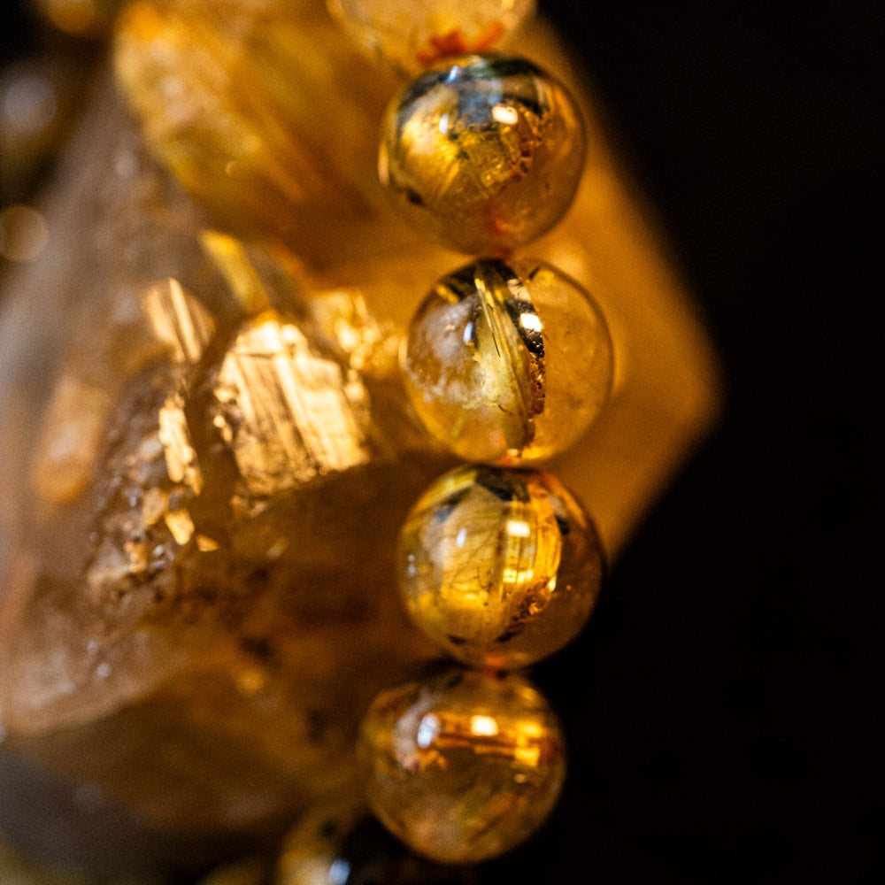 このブレスレットは、高品質なブラジル産ルチルクオーツを使用しています。太陽ルチル(ヘマタイト/ルチル)クオーツは、金属光沢のある黒いヘマタイトを核として、その周りに金紅石のルチル結晶が伸びている特殊なルチルクォーツです。「太陽ルチル」や「スタールチル」とも呼ばれています。内包された黄金色のルチル(金線)が魅力的で、その輝きが「金運の石」として多くの方に親しまれています。
