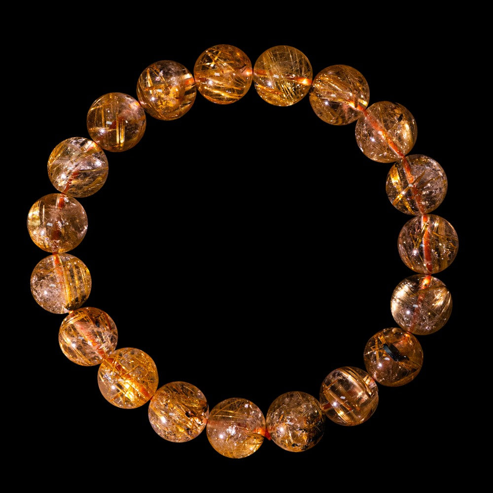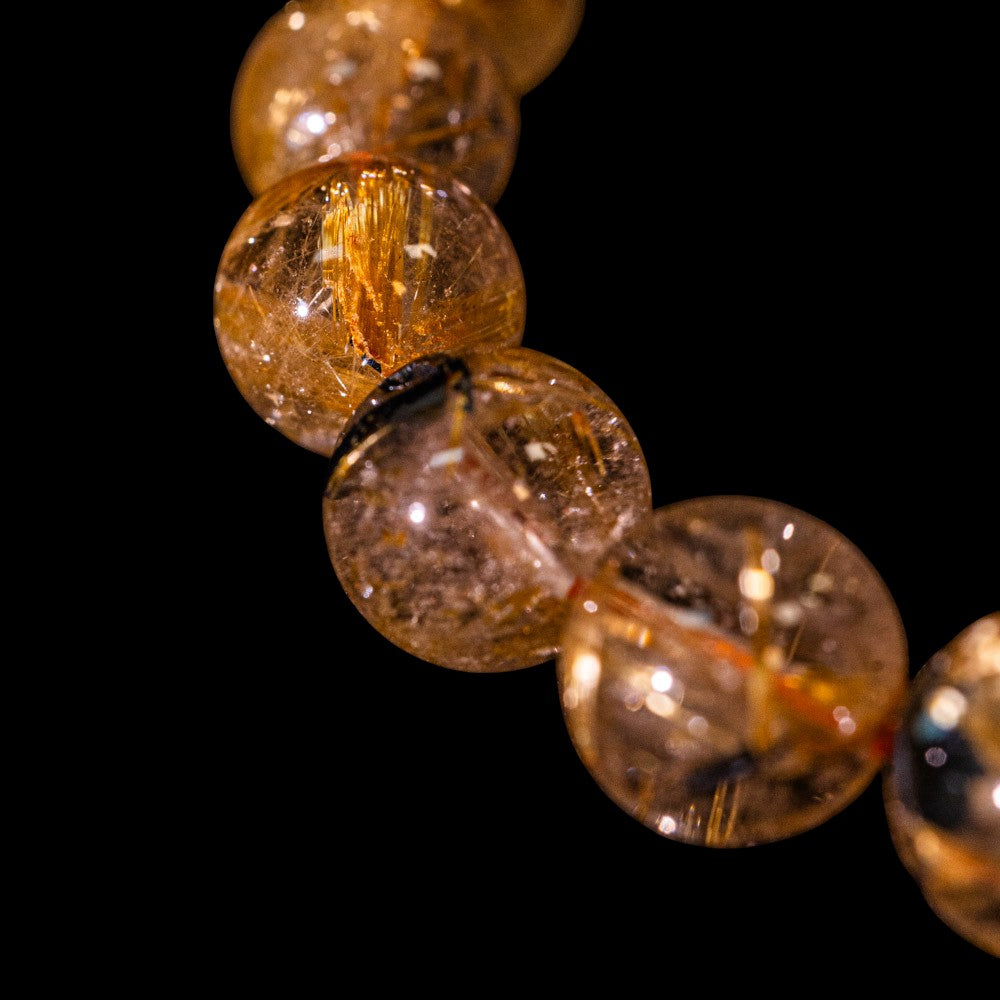 注文から2-3日以内に配送(土日除く)このブレスレットは、高品質なブラジル産ルチルクオーツを使用しています。太陽ルチル(ヘマタイト/ルチル)クオーツは、金属光沢のある黒いヘマタイトを核として、その周りに金紅石のルチル結晶が伸びている特殊なルチルクォーツです。「太陽ルチル」や「スタールチル」とも呼ばれています。内包された黄金色のルチル(金線)が魅力的で、その輝きが「金運の石」として多くの方に親しまれています。ルチルクオーツは、特有の針入り水晶としても知られ、独特の内包物(インクルージョン)が特徴です。