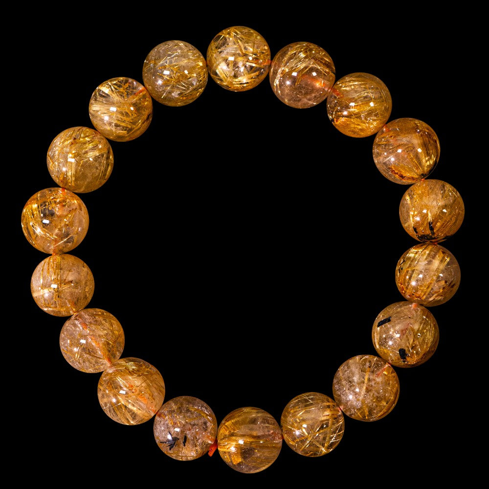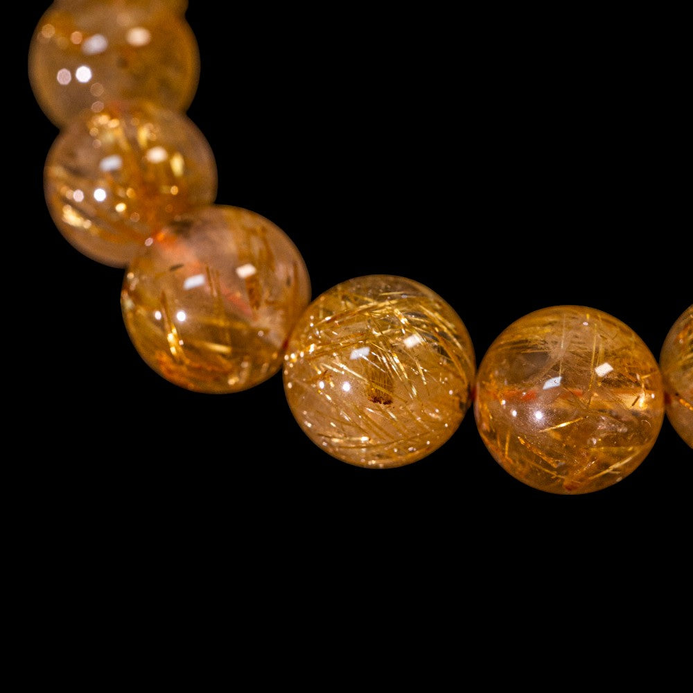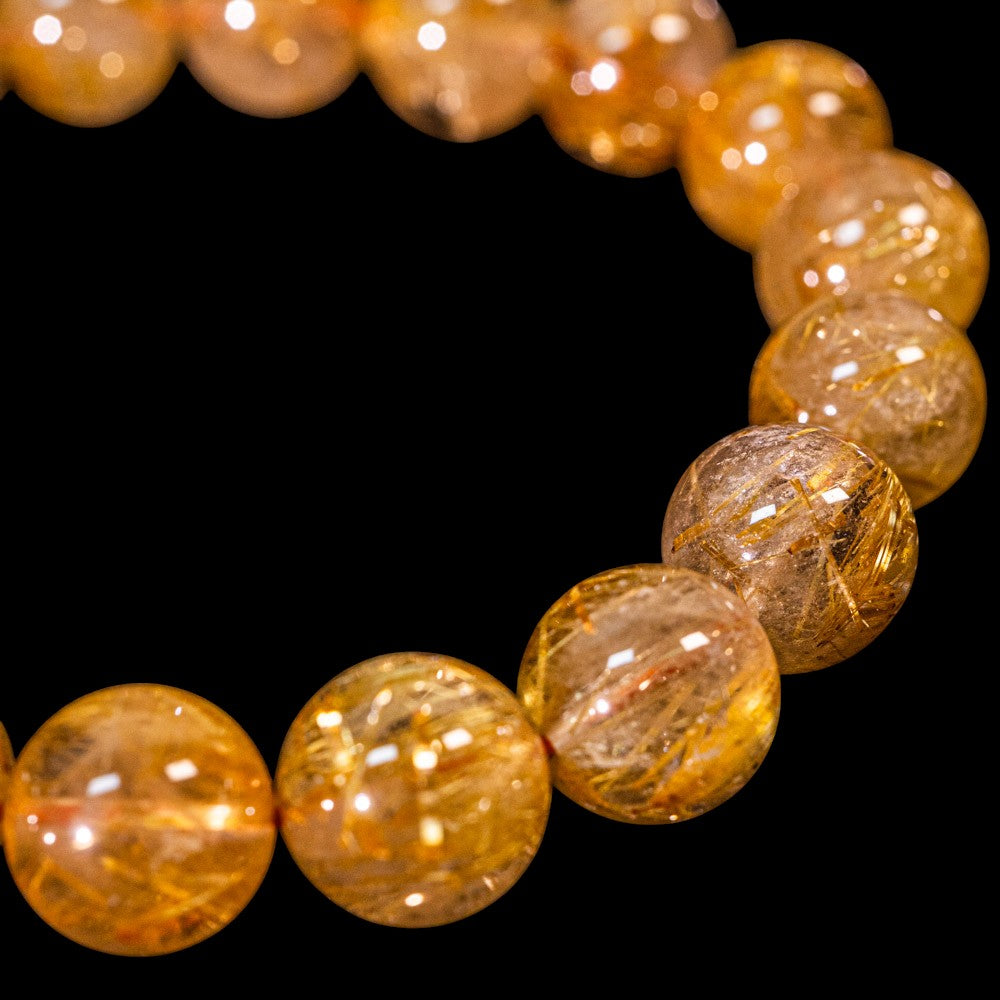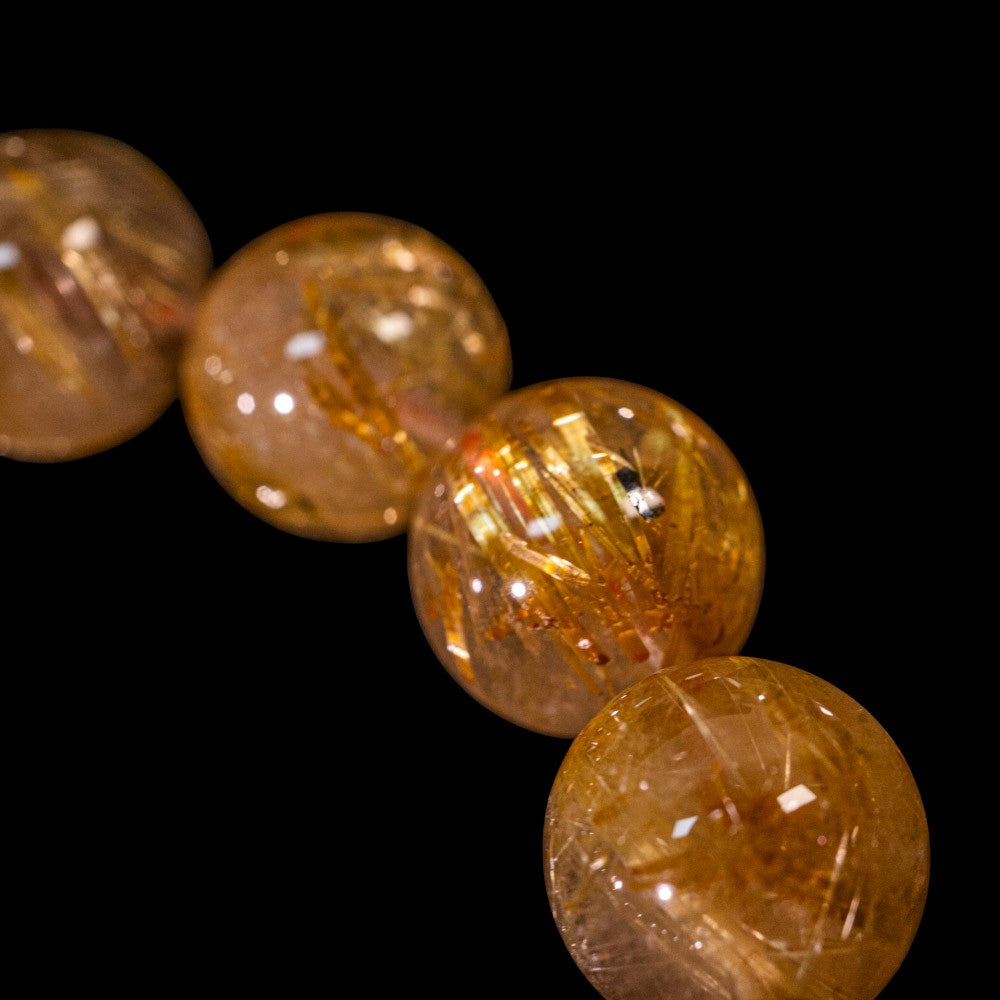 注文から2-3日以内に配送(土日除く)このブレスレットは、高品質なブラジル産ルチルクオーツを使用しています。太陽ルチル(ヘマタイト/ルチル)クオーツは、金属光沢のある黒いヘマタイトを核として、その周りに金紅石のルチル結晶が伸びている特殊なルチルクォーツです。「太陽ルチル」や「スタールチル」とも呼ばれています。内包された黄金色のルチル(金線)が魅力的で、その輝きが「金運の石」として多くの方に親しまれています。ルチルクオーツは、特有の針入り水晶としても知られ、独特の内包物(インクルージョン)が特徴です。