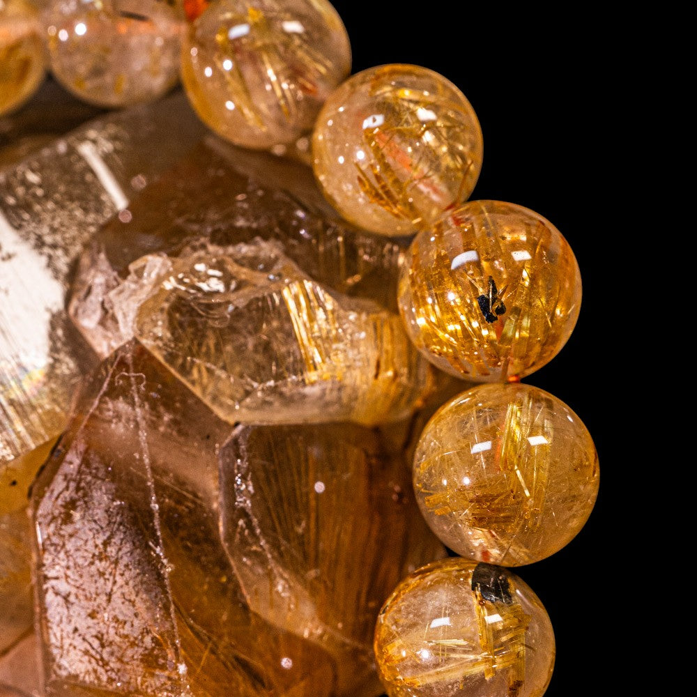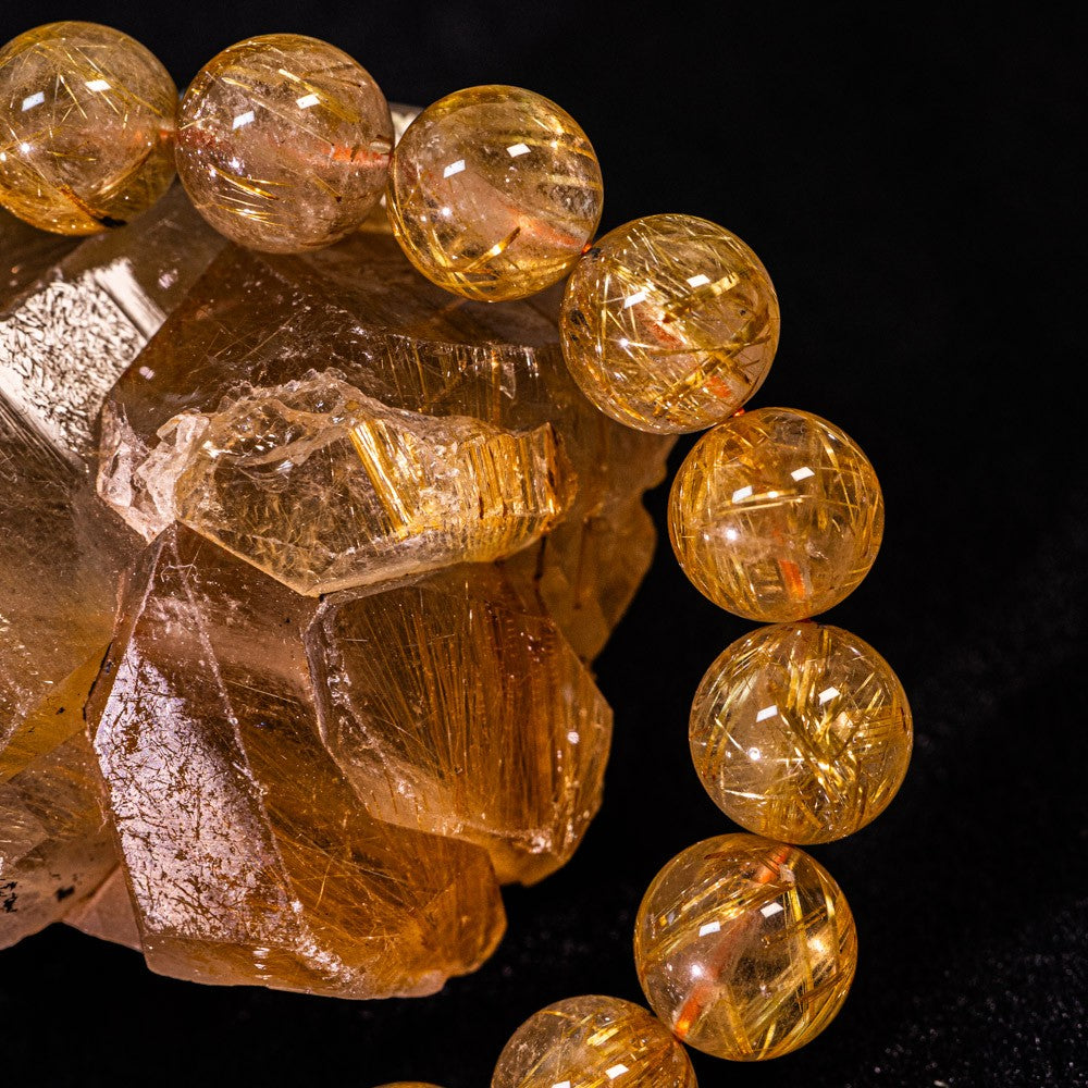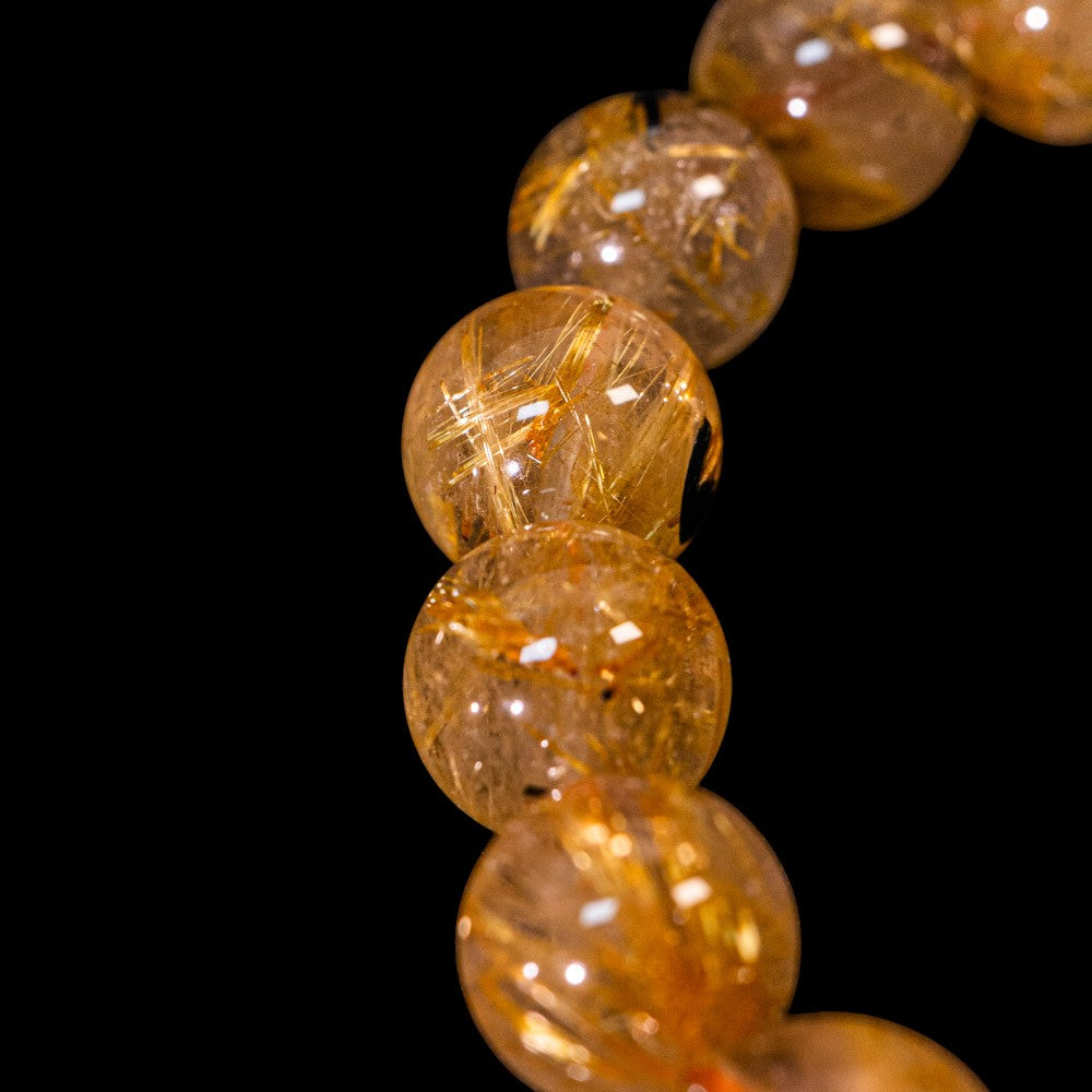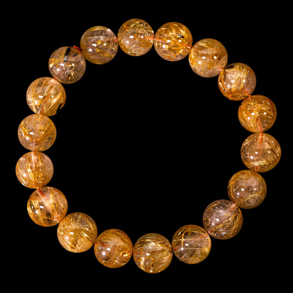 注文から2-3日以内に配送(土日除く)このブレスレットは、高品質なブラジル産ルチルクオーツを使用しています。太陽ルチル(ヘマタイト/ルチル)クオーツは、金属光沢のある黒いヘマタイトを核として、その周りに金紅石のルチル結晶が伸びている特殊なルチルクォーツです。「太陽ルチル」や「スタールチル」とも呼ばれています。内包された黄金色のルチル(金線)が魅力的で、その輝きが「金運の石」として多くの方に親しまれています。ルチルクオーツは、特有の針入り水晶としても知られ、独特の内包物(インクルージョン)が特徴です。