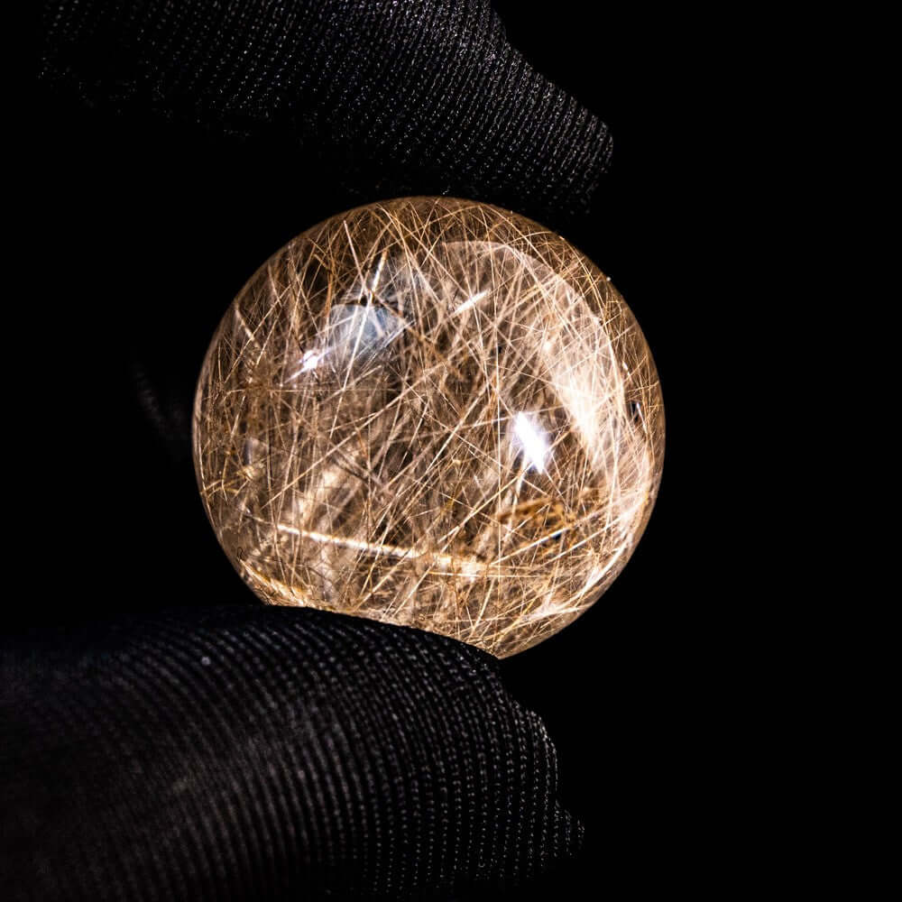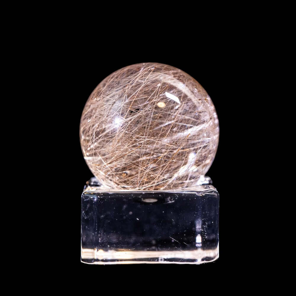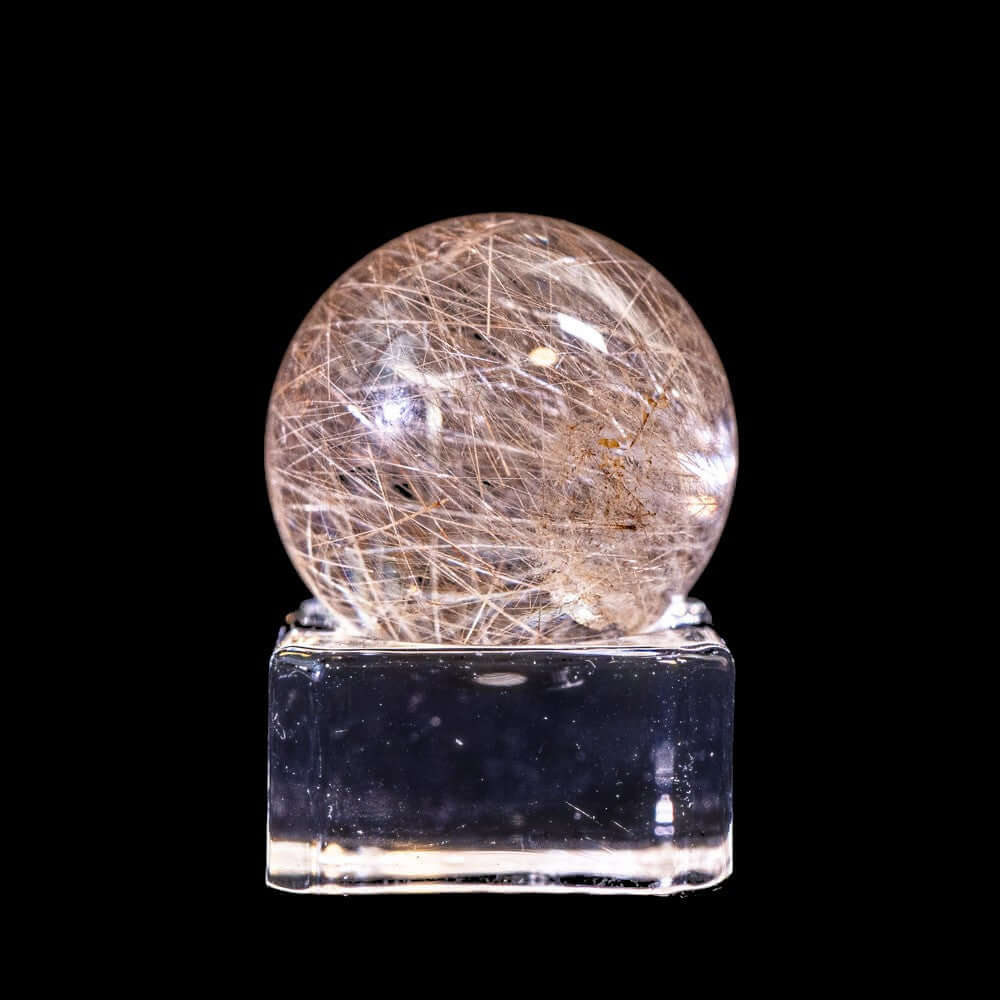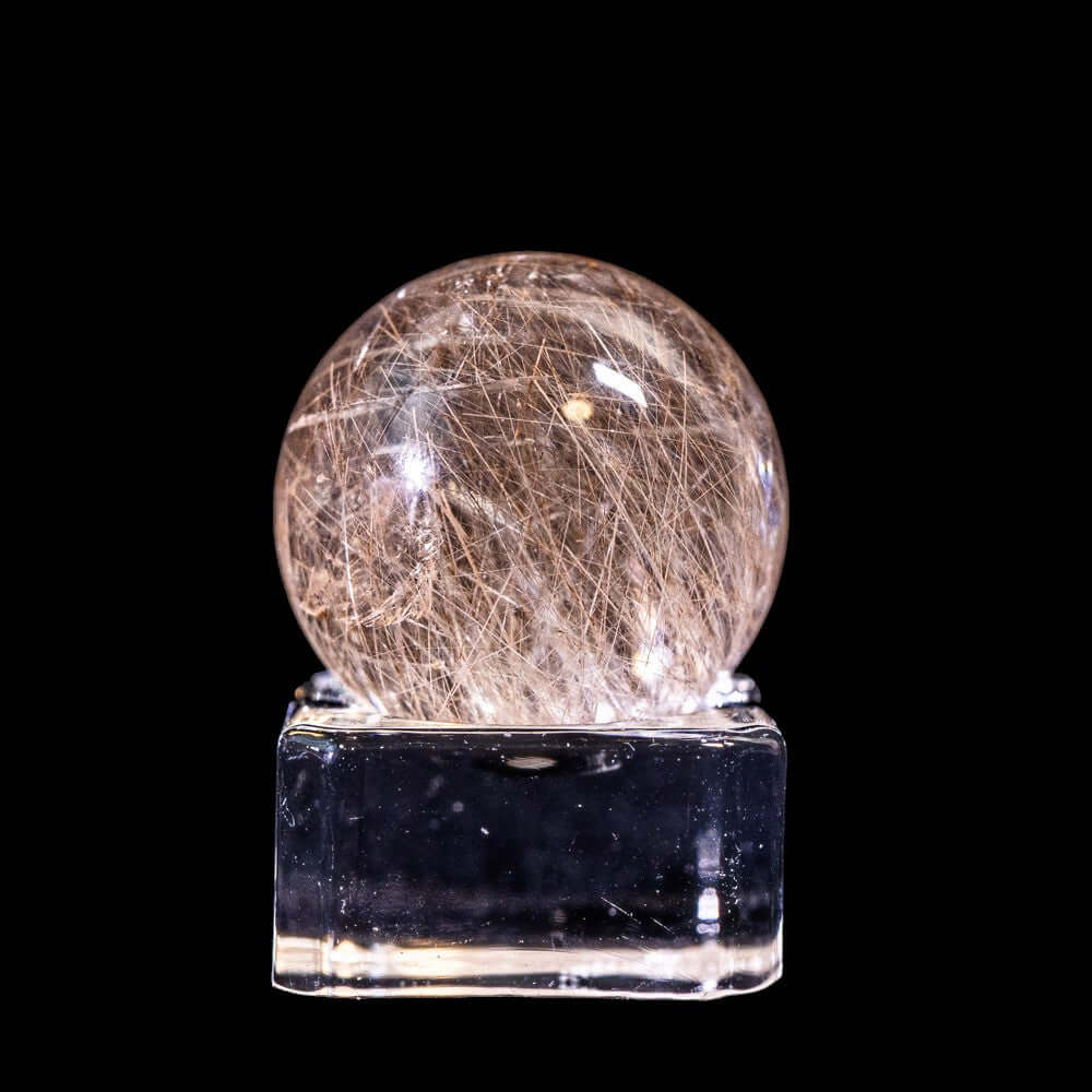 このスフィアは、高品質なブラジル産ルチルクォーツから削り出された丸玉タイプです。透明度の高い水晶の中に、針状鉱物であるルチルが立体的に広がり、角度や光の当たり方で表情が変わります。球体ならではの奥行きと完成度をお楽しみください。